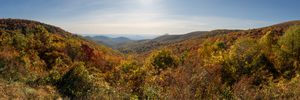 A panoramic view of the North Carolina mountains during peak fall color. Layers of ridges stretch into the distance, glowing in shades of gold, orange, and deep red.